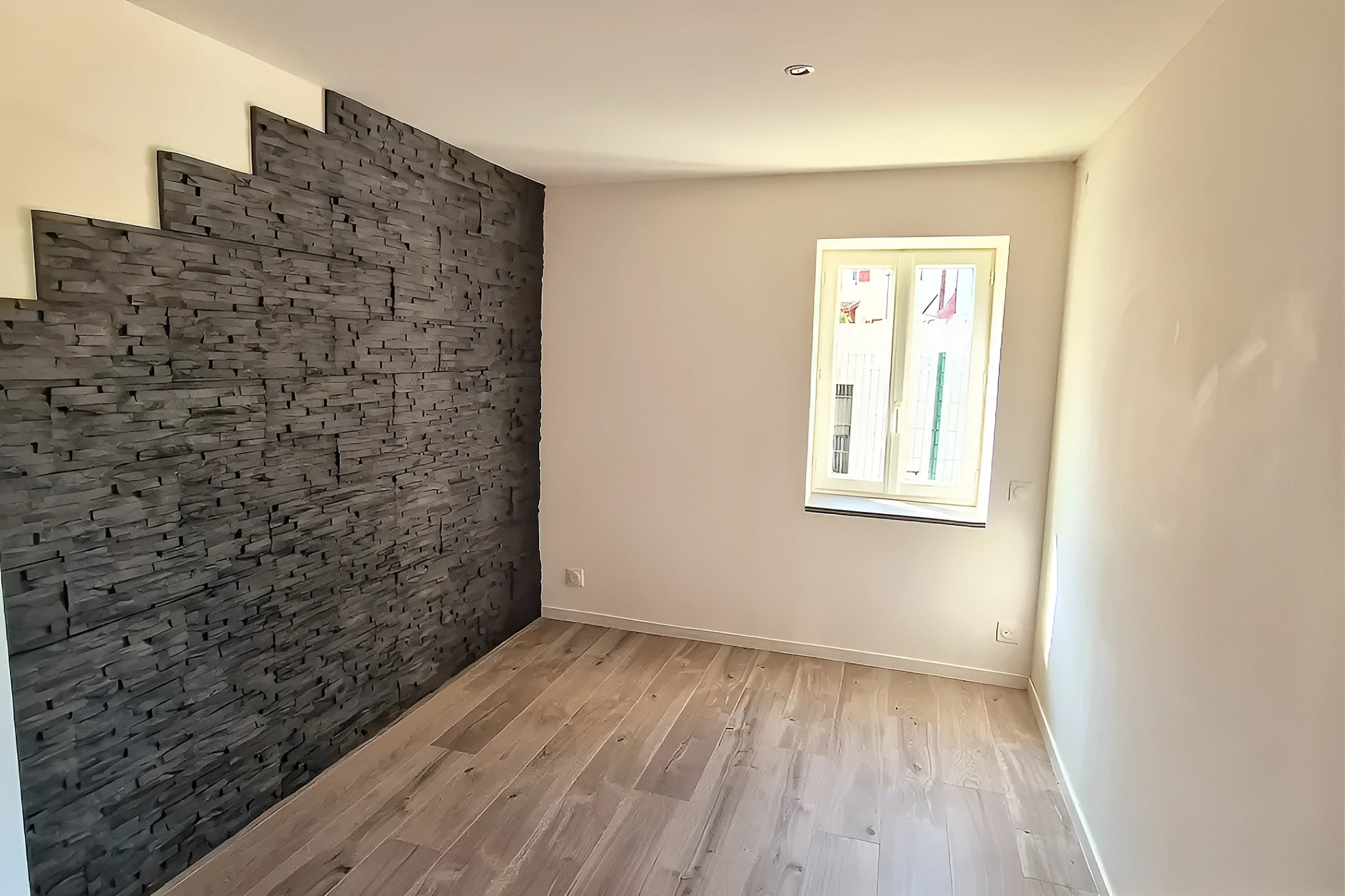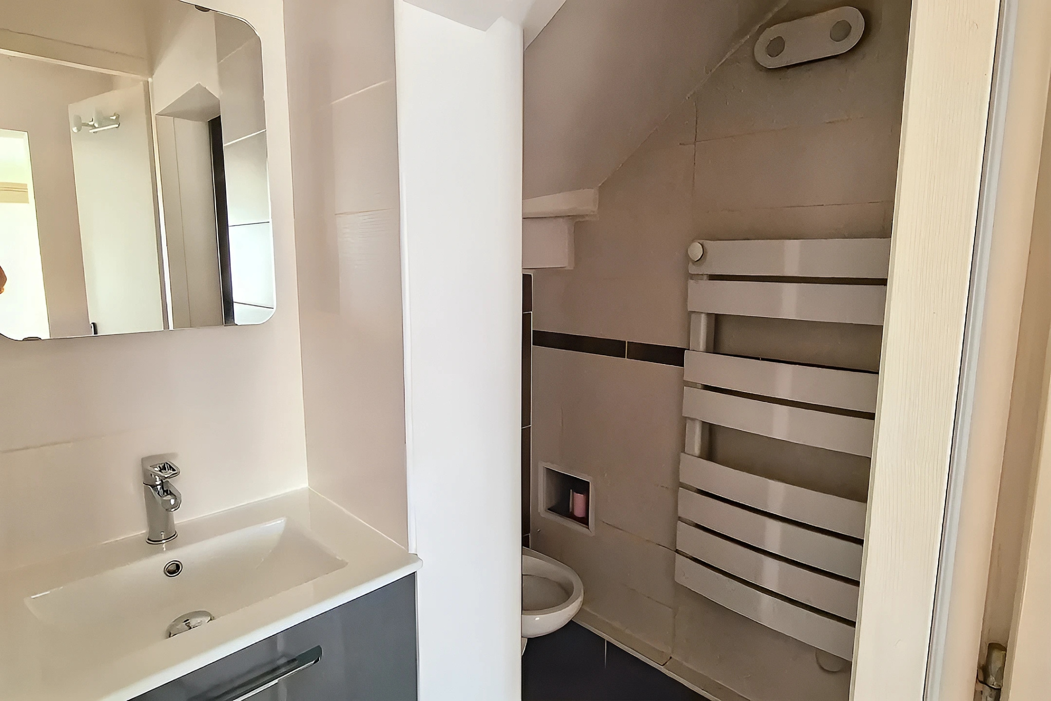 Une chambre, à laquelle s’ajoute une seconde pièce pouvant être aménagée en bureau ou en chambre d’enfant, compose l’espace nuit. Tout à côté, une salle d’eau avec WC.