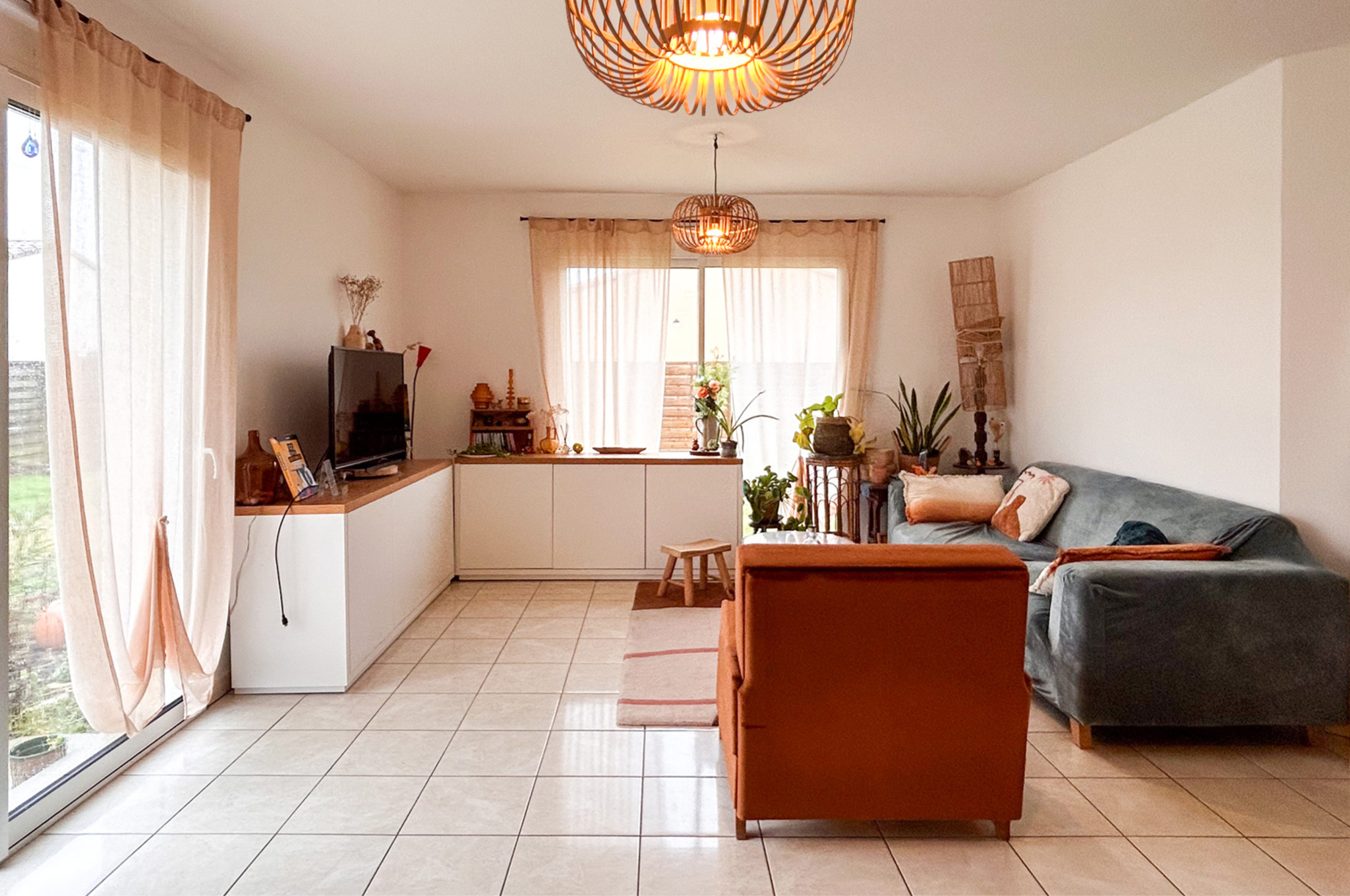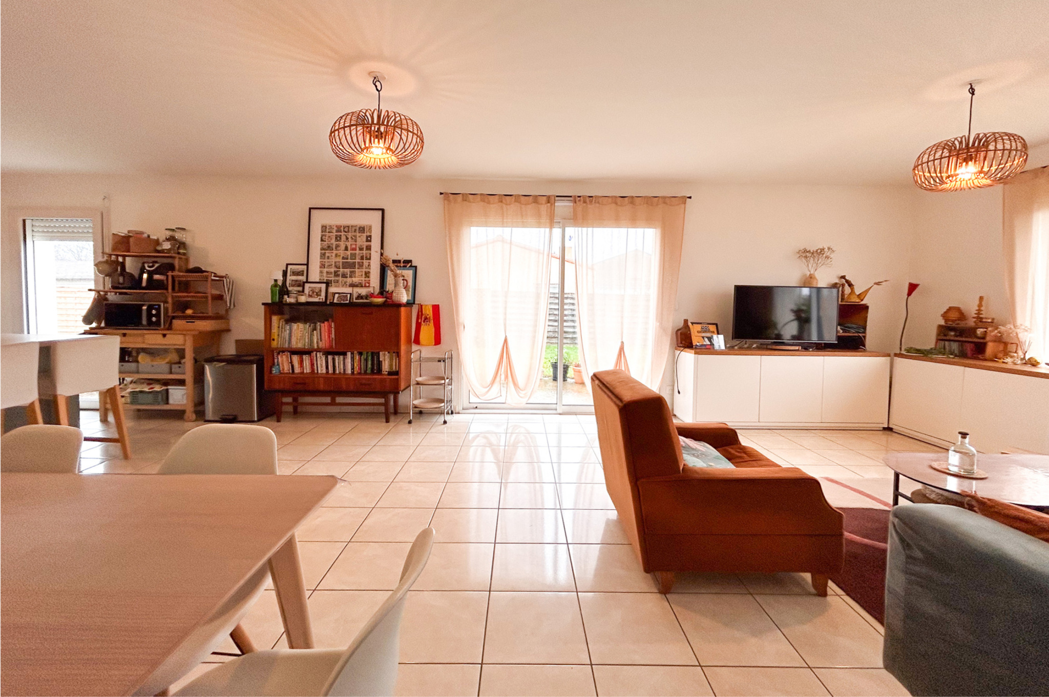 Une belle pièce de vie d’environ 45 m², très lumineuse, ouverte sur le jardin et une terrasse exposée sud-ouest