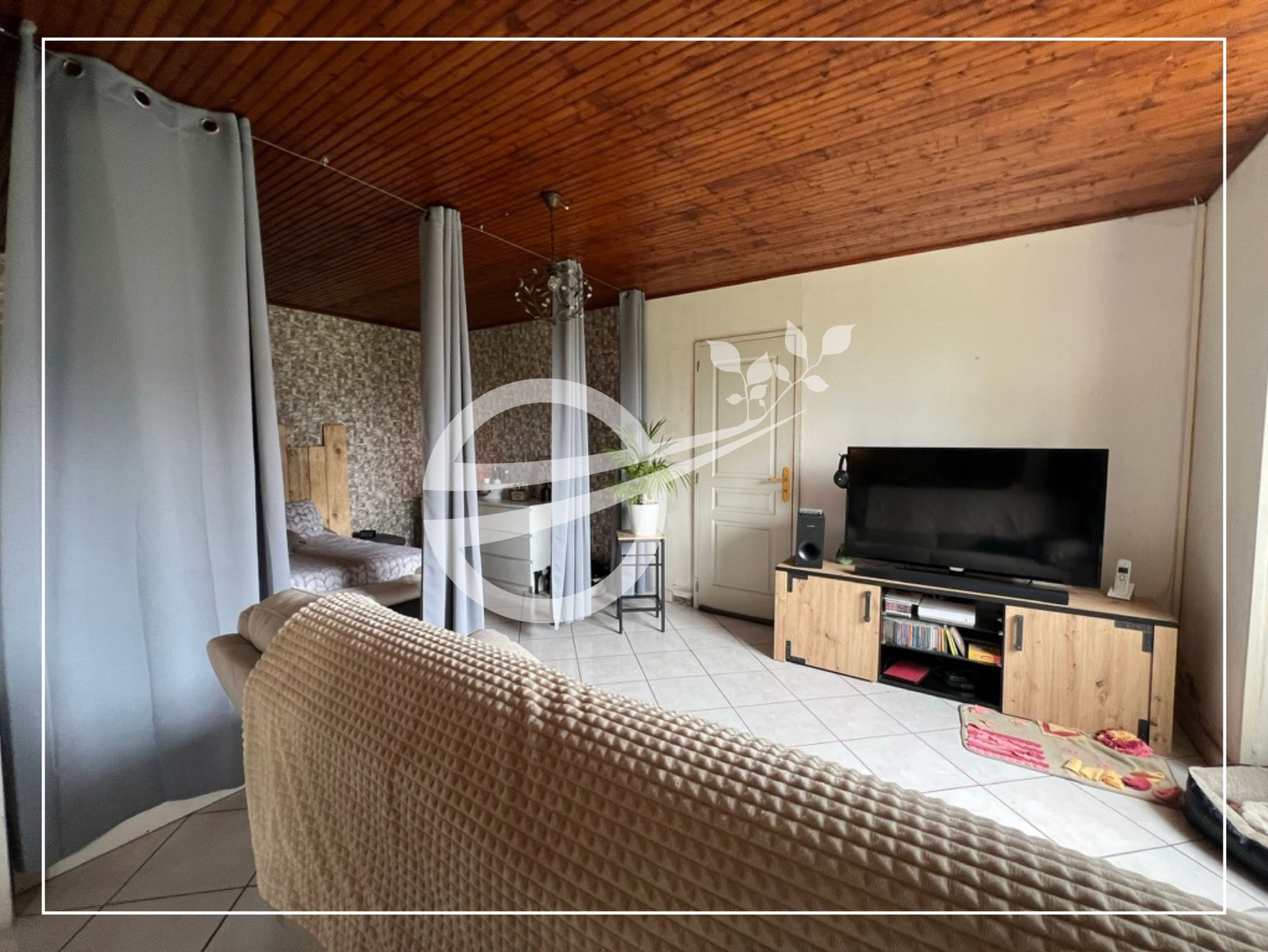 La pièce de vie d’environ 50 m², intégrant un espace cuisine, constitue le cœur du bien. L’exposition plein sud et les ouvertures permettent un apport de lumière naturel régulier.
