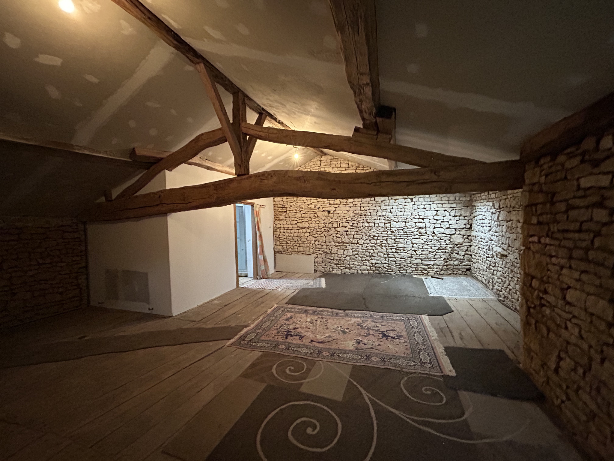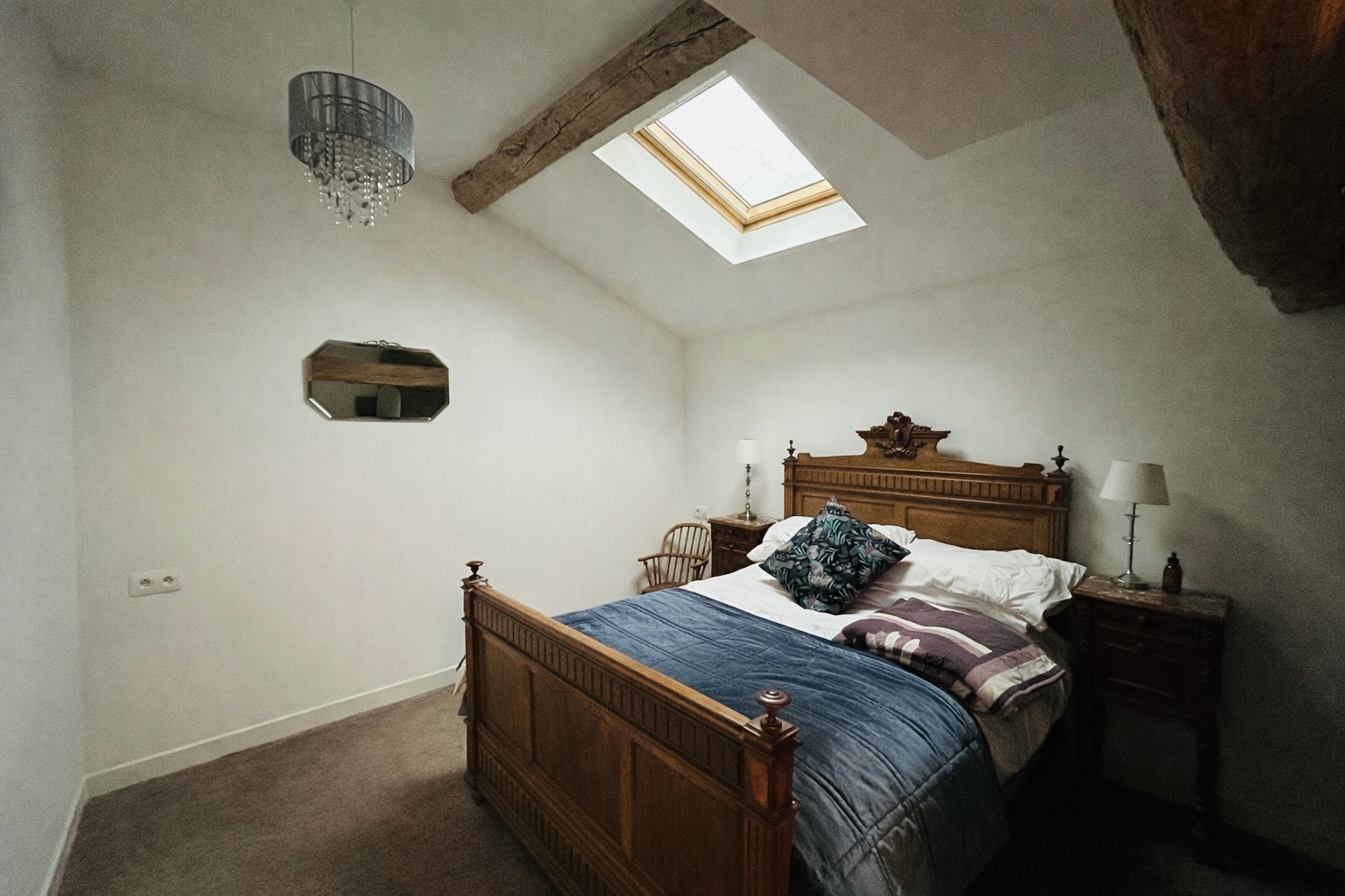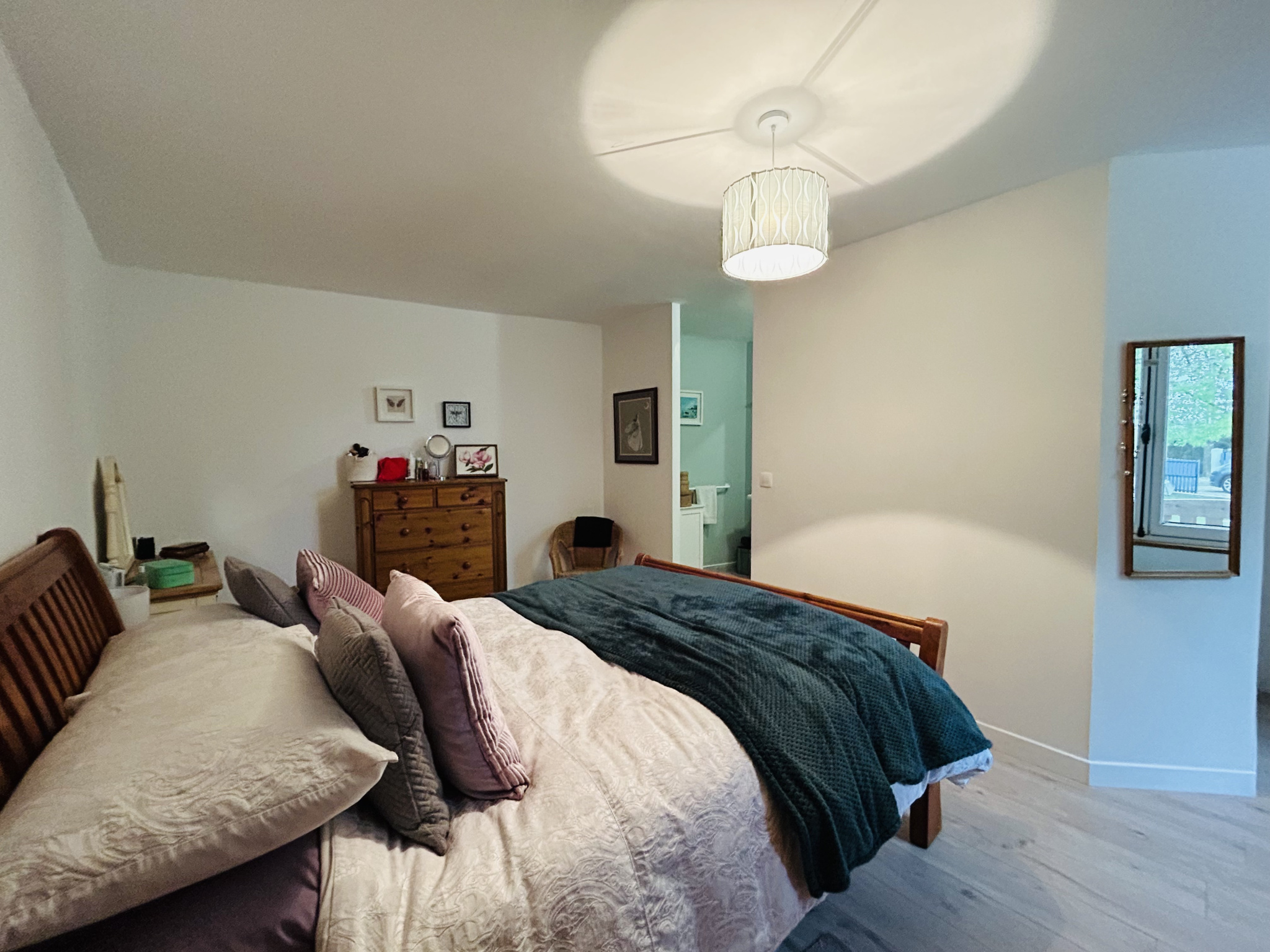 Le rez-de-chaussée propose également une chambre avec salle d’eau privative, idéale pour une vie de plain-pied ou pour anticiper des besoins d’accessibilité. Une grande seconde chambre au rez-de-chaussée (actuel atelier). Avec le WC situé à proximité, elle offre un excellent potentiel pour créer une nouvelle salle d’eau attenante.