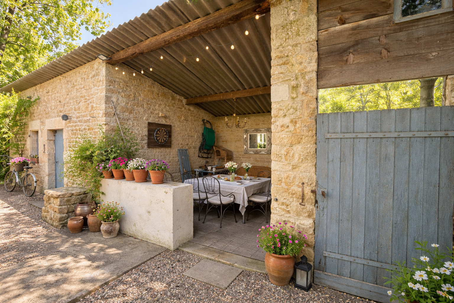 Outside, the property benefits from a charming, low-maintenance gravelled courtyard with gated access, as well as a garage and barn. There is also a shaded dining area, ideal for enjoying meals outdoors away from the sun.